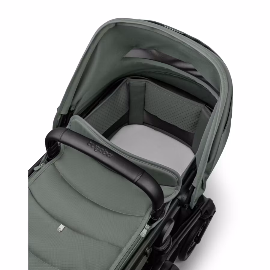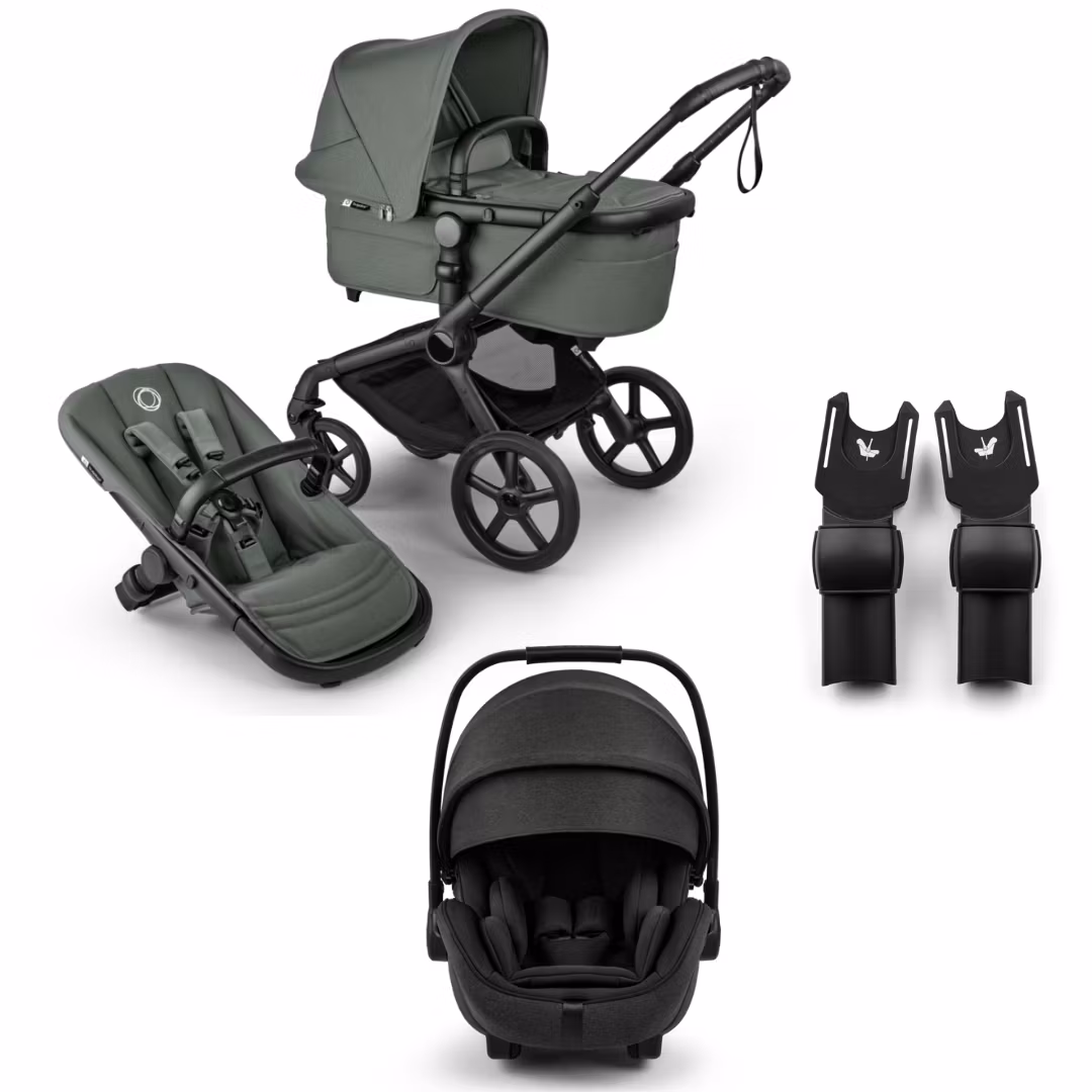 Ett komplett premiumpaket för nyblivna förÀldrar: Bugaboo Fox 5 Renew i Forest Green, det nya babyskyddet Otter by Nuna och smidig adapter för enkel övergÄng mellan bil och vagn.