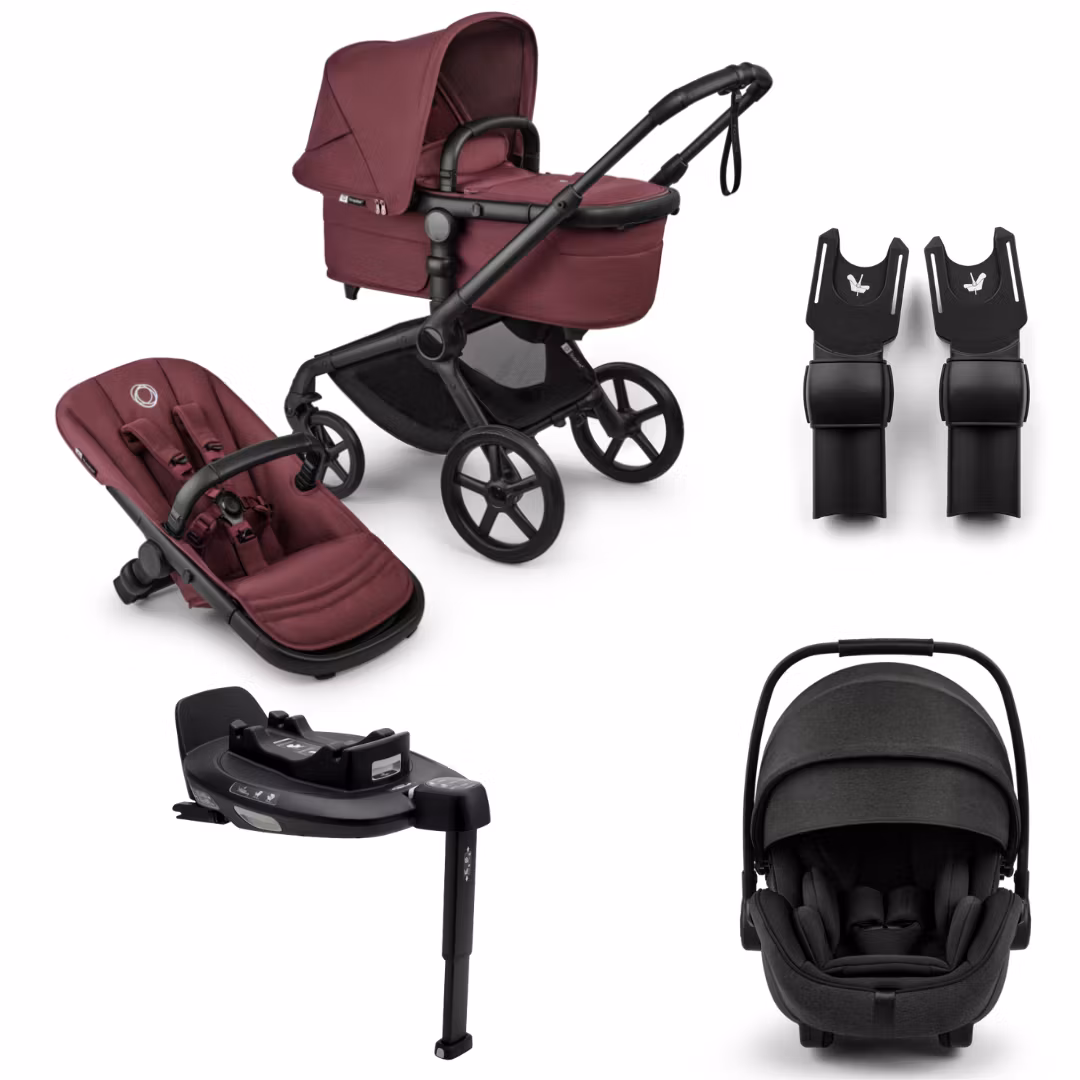 Ett komplett premiumpaket för nyblivna föräldrar: Bugaboo Fox 5 Renew i Dark Cherry, babyskyddet Otter by Nuna med 360° Isofix-bas och smidig adapter för enkel övergång mellan bil och vagn. Snyggt, säkert och redo från dag ett.