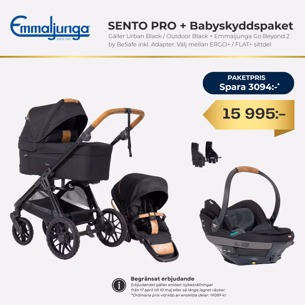 Under en begränsad period får du ett komplett premiumpaket med Sento Pro barnvagn med Liggdel+ och Ergo+ sittdel, samt babyskyddet Emmaljunga Go Beyond 2 by BeSafe inklusive adapter – allt för 15 995 kr.