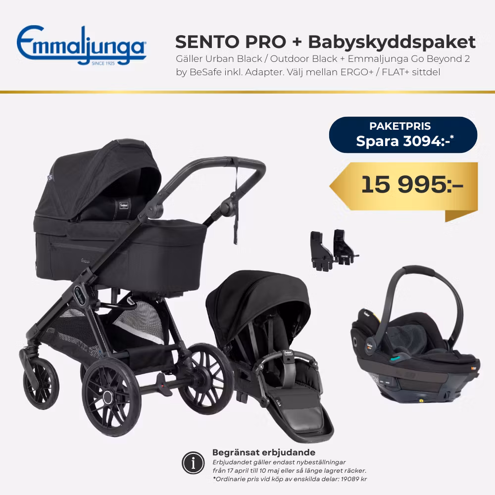 Under en begränsad period får du ett komplett premiumpaket med Sento Pro, Liggdel+ och Ergo+ sittdel, samt babyskyddet Emmaljunga Go Beyond 2 by BeSafe inklusive adapter – allt för 15 995 kr.