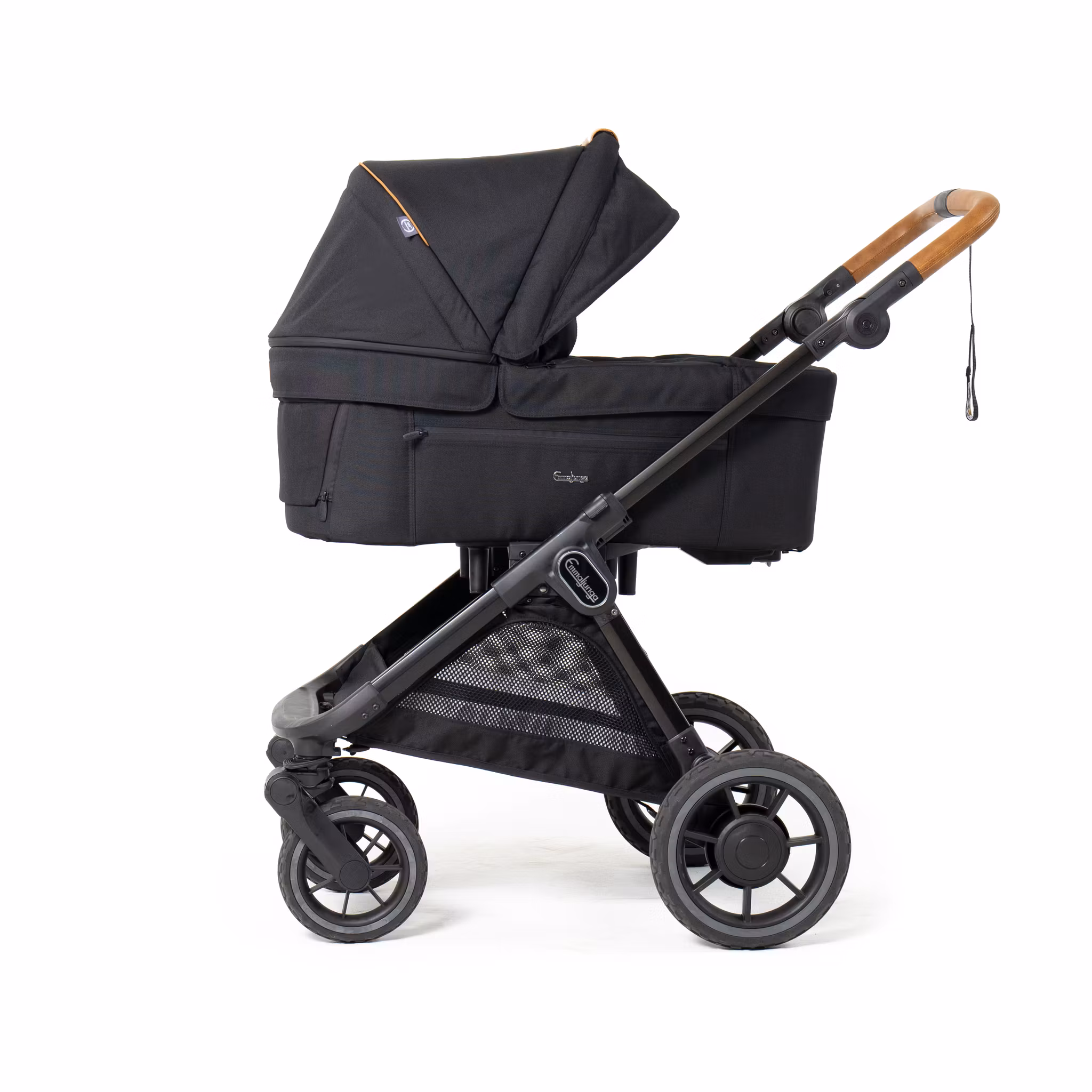 Chassit är robust men ändå smidigt, med stora punkteringsfria hjul som ger en mjuk körkänsla på både stadsgator och ojämna underlag. Den justerbara fyrhjulsfjädringen gör att vagnen rullar stabilt året runt, oavsett väder och terräng.