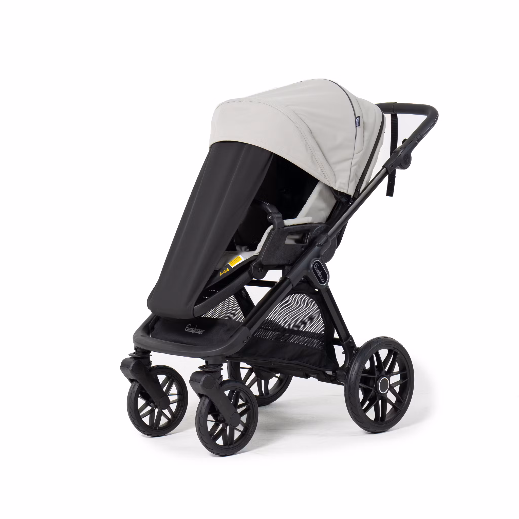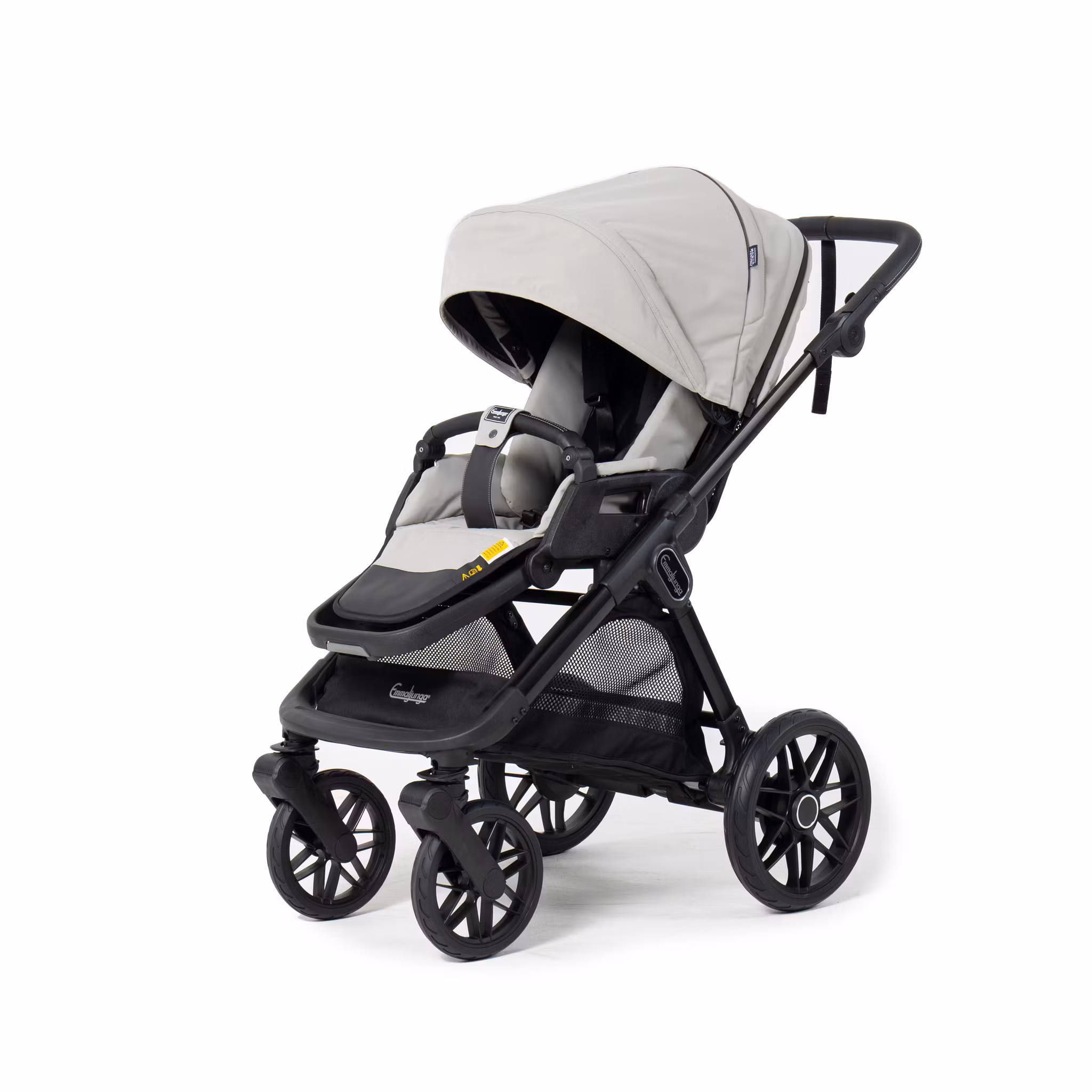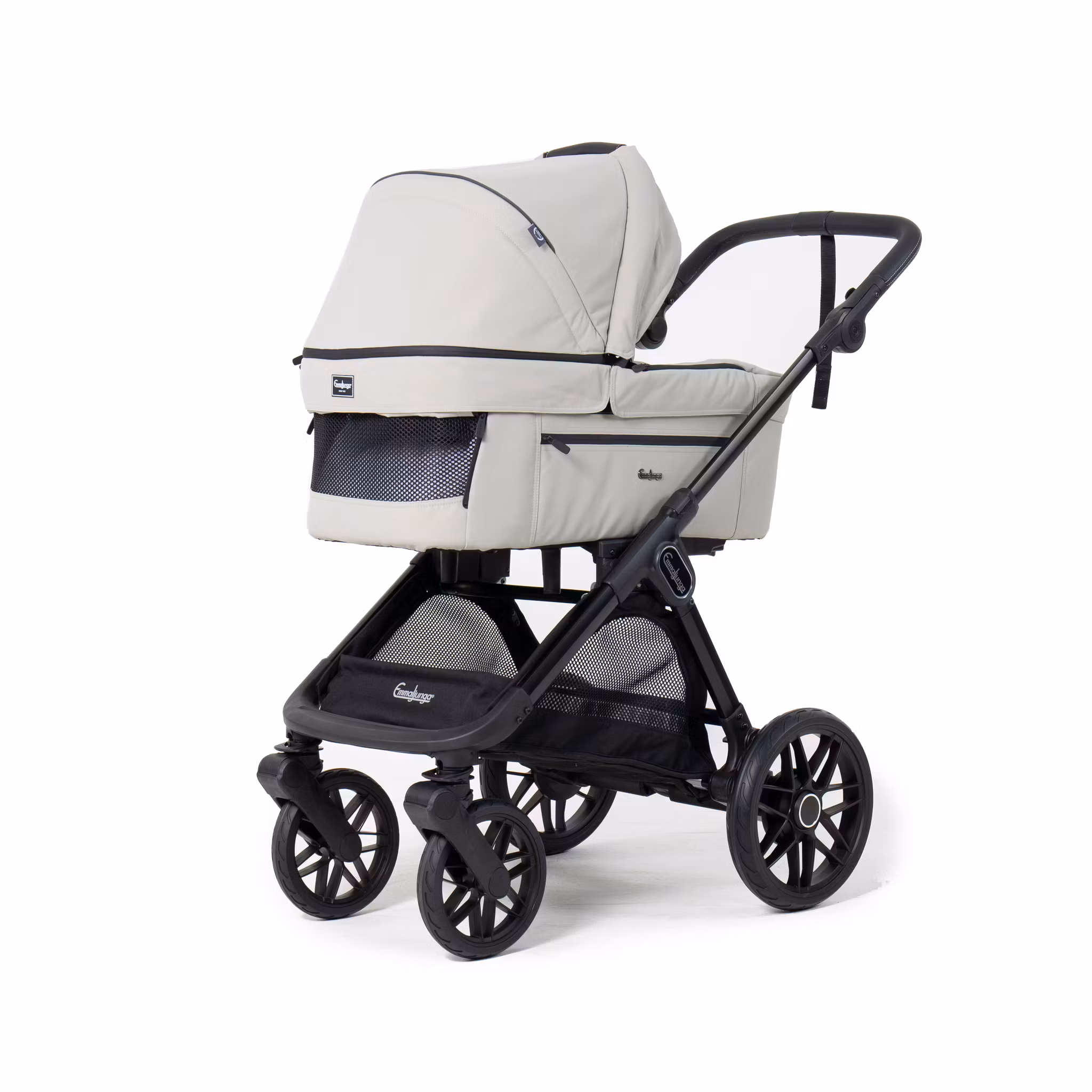 Chassit är robust men ändå smidigt, med stora punkteringsfria hjul som ger en mjuk körkänsla på både stadsgator och ojämna underlag. Den justerbara fyrhjulsfjädringen gör att vagnen rullar stabilt året runt, oavsett väder och terräng.