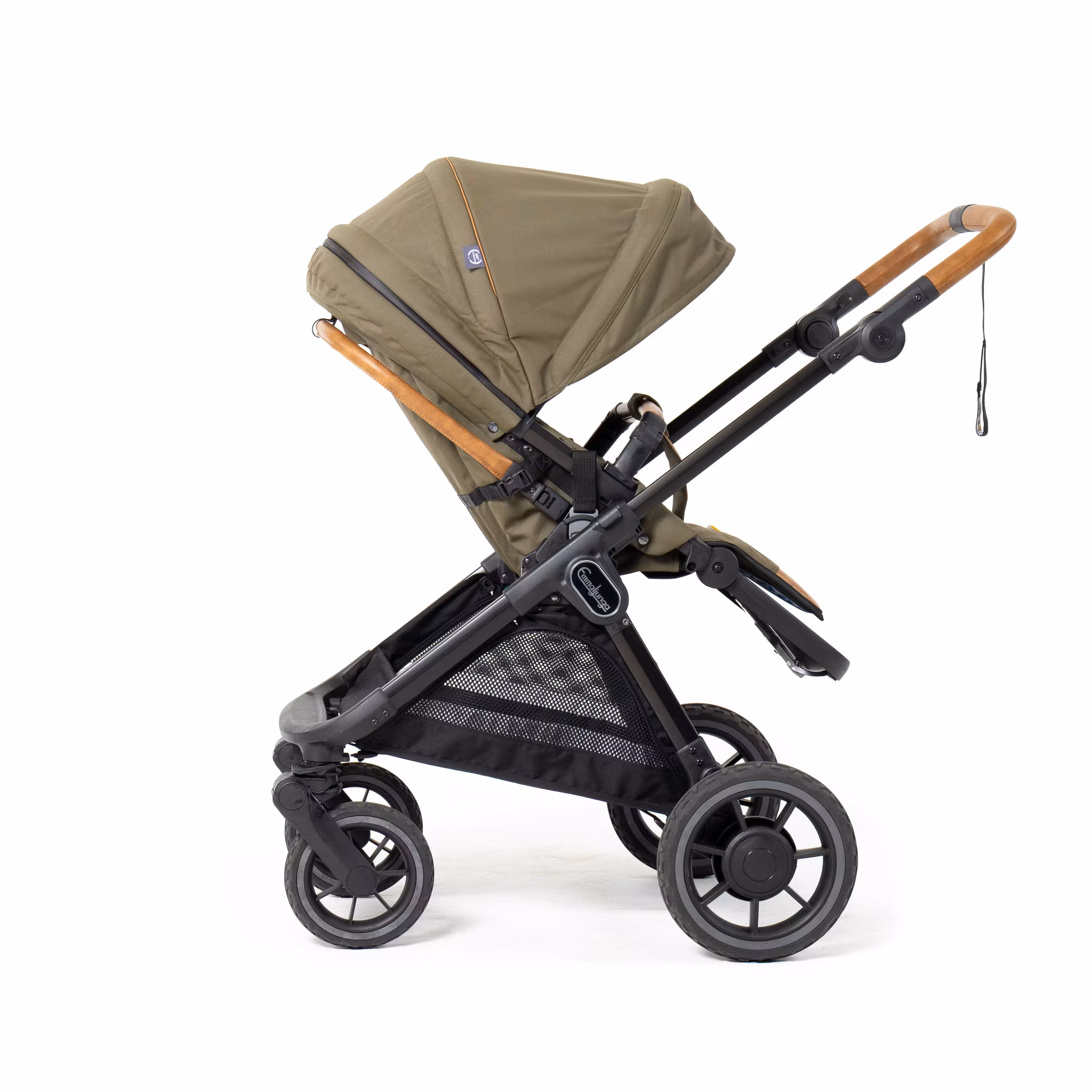 Färg denna barnvagn: Outdoor Olive med bruna handtag och brun bygel