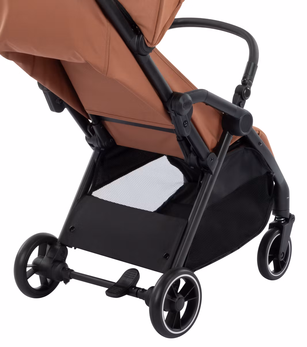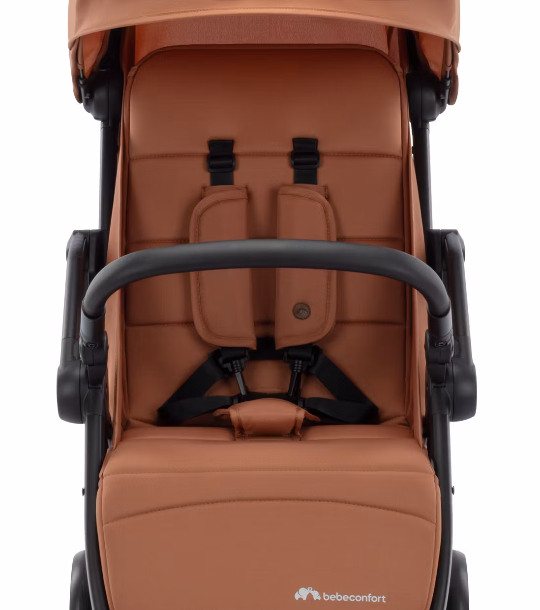 Säkerhetsbygeln och handtaget är klädda i stilrent svart, vilket skapar en elegant kontrast mot den varma Mineral Copper-nyansen och ger vagnen en premiumkänsla som känns både modern och tidlös.