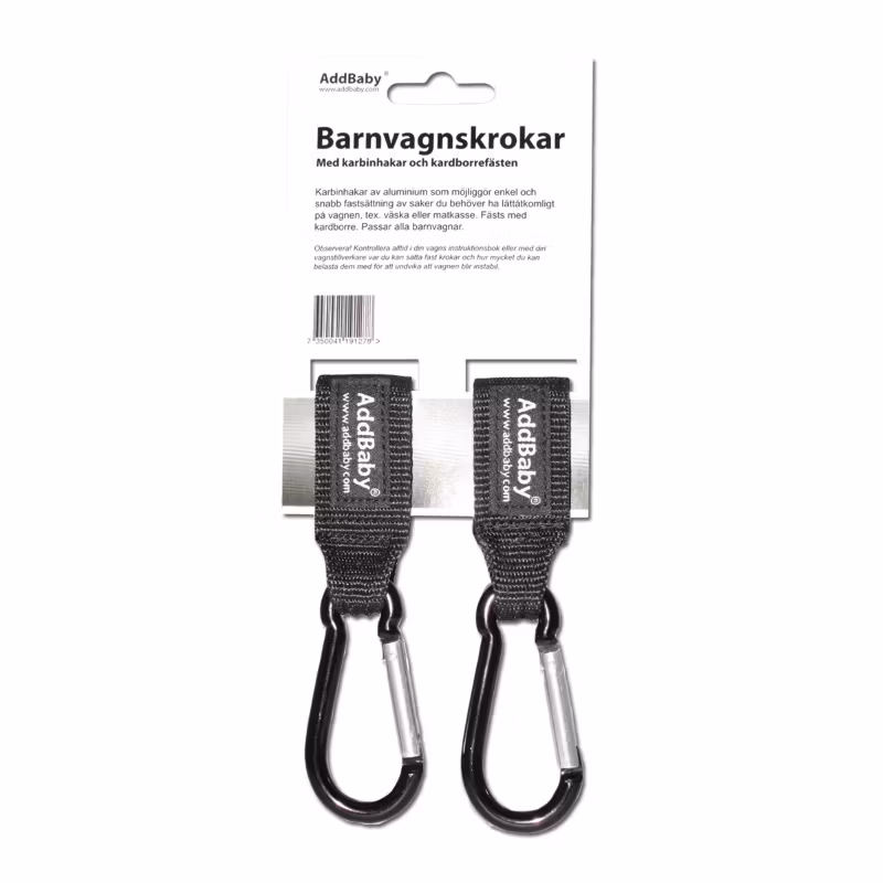 AddBaby Barnvagnskrokar Lätta karbinkrokar av aluminium som möjliggör enkel och snabb fastsättning av saker du behöver ha lättåtkomligt på din vagn. Fästs med kardborre. En kundförpackning innehåller ett par krokar. Observera! Kontrollera alltid i din vagns instruktionsbok var du kan sätta fast krokar och hur mycket du kan belasta dem med för att undvika att vagnen blir instabil.