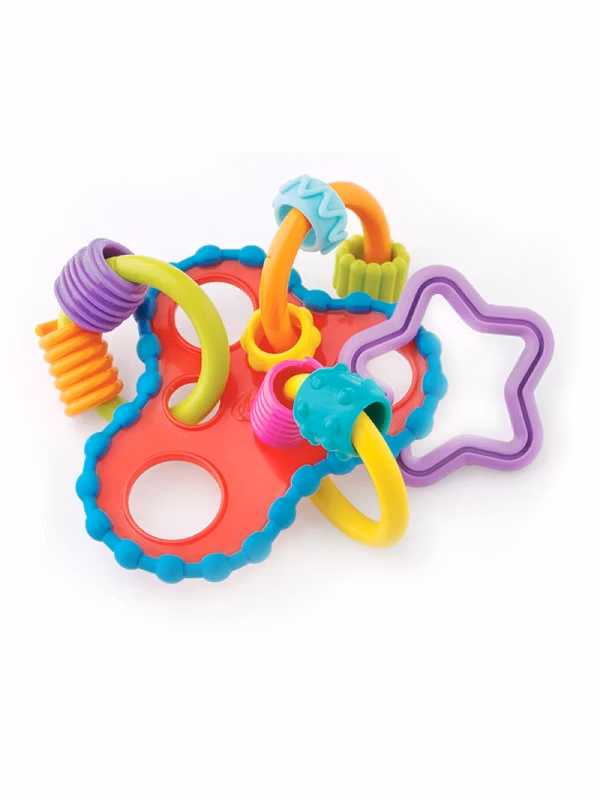 Det är en rolig blandning av olika leksaker som barnet kan greppa och bita i. Den har en mjuk yta som är skön att ta på och som är bekväm att hålla. Den är lätt att bära med sig och kan följa med barnet vart det än går. Skallran är även lätt att rengöra.