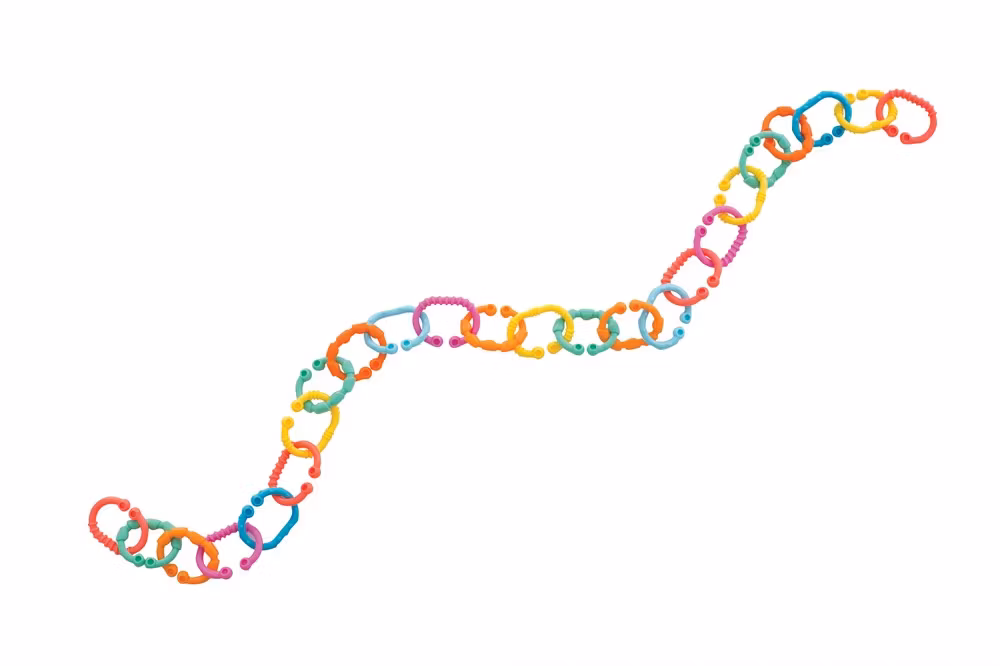 24 stycken plastringar att leka med. 6 stycken olika färger och 6 stycken olika mönster. Bygg ihop dem och fäst på vagnen så kan barnet leka och bita på dem.