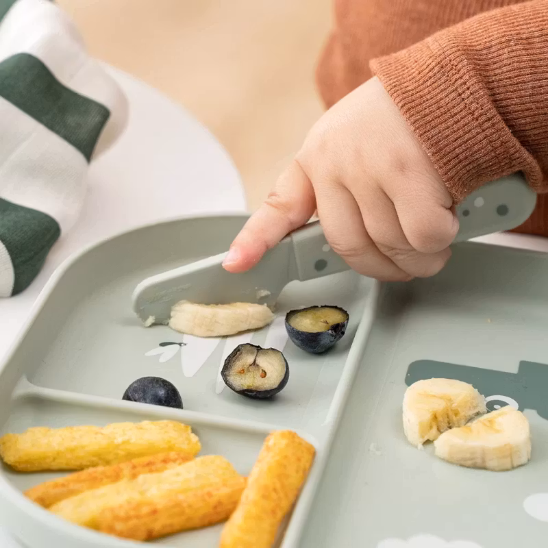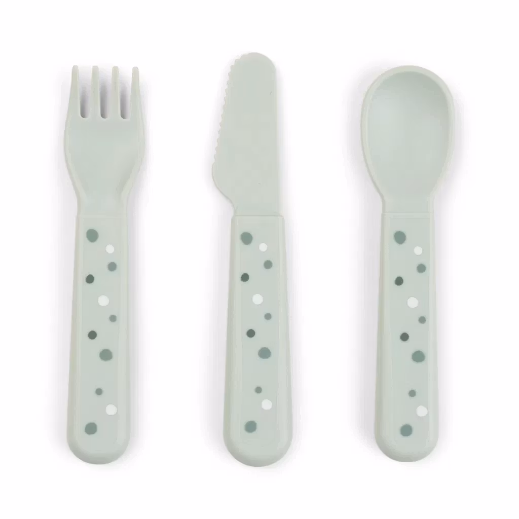 Foodie bestickset med Happy dots har rundade kanter, vilket gör det säkert och bekvämt för ditt barn att träna på att äta med bestick. Dessa bestick är perfekt för små händer och har testats noggrant av barn. Det söta setet för spädbarn och småbarn består av en sked, en gaffel och en kniv. Efter otaliga familjemiddagar och barnkalas kan besticken sorteras som plastavfall och återanvändas till nya vardagsprodukter. Besticken har en matt silkeslen yta och matchar resten av Foodie-kollektionen.